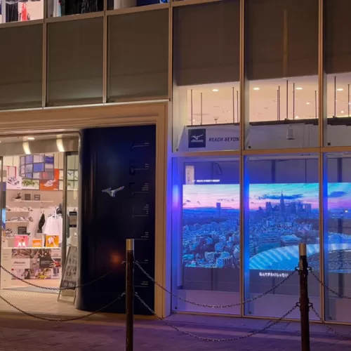 大阪府にある「MIZUNO OSAKA」において、透過型LEDビジョン Nシリーズ(P2.6) を導入しました。高精細表示と高輝度透過構造を両立し、ブランドの世界観をダイレクトに伝えるウィンドウ演出を実現した導入事例です。