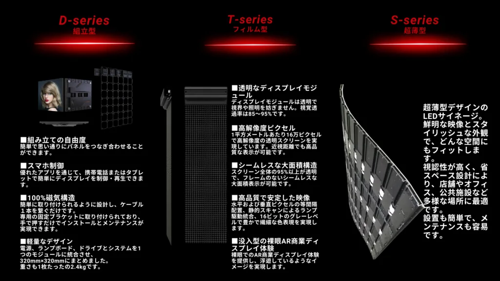 この技術の最大の特徴は、「透過性」と「軽量性」。透過型LEDフィルムは、背景を損なうことなく映像を表示できるため、ガラス窓やショーウィンドウに最適です。また、通常のLEDパネルに比べて大幅に軽く、施工も簡易なため、既存の構造物に負担をかけずに導入することができます。