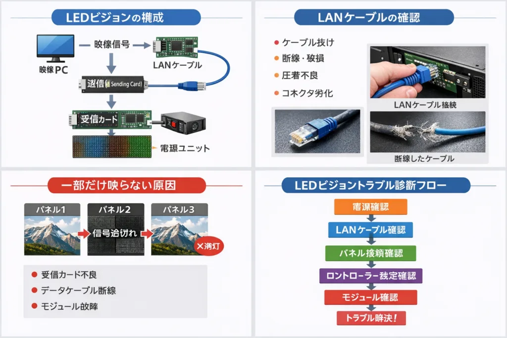 LEDビジョンが映らない・ちらつく原因を、電源・LANケーブル・設定など現場で確認できるポイントから分かりやすく解説します。